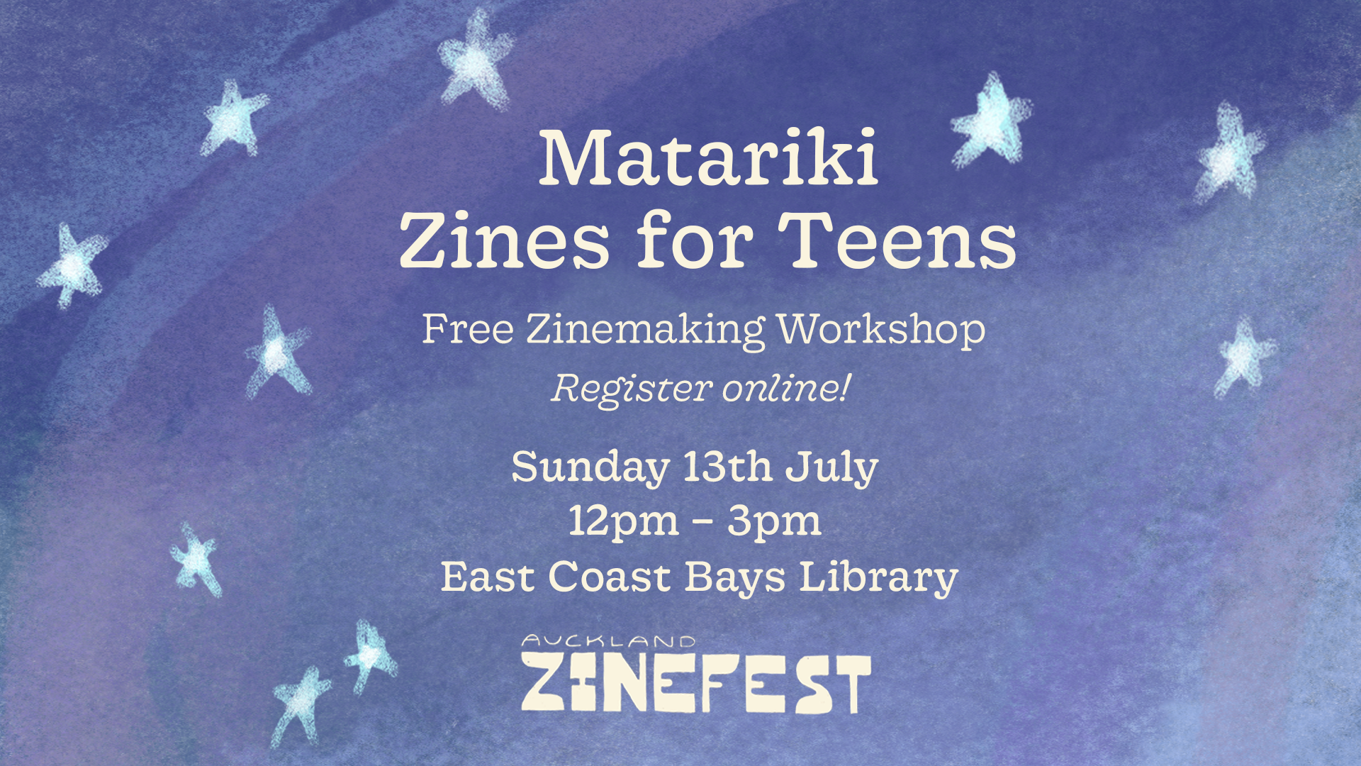 Join us for a Matariki focused zinemaking workshop β perfect for teens to get creative during the school holidays. Held at the East Coast Bays Library big and quiet event space so there's plenty of room for a day of creating. Bring your pens, stickers and more (or use ours!) to make zines this Matariki. Spin the whetΕ« wheel and pick a topic, then collaborate, chill or get stuck in!